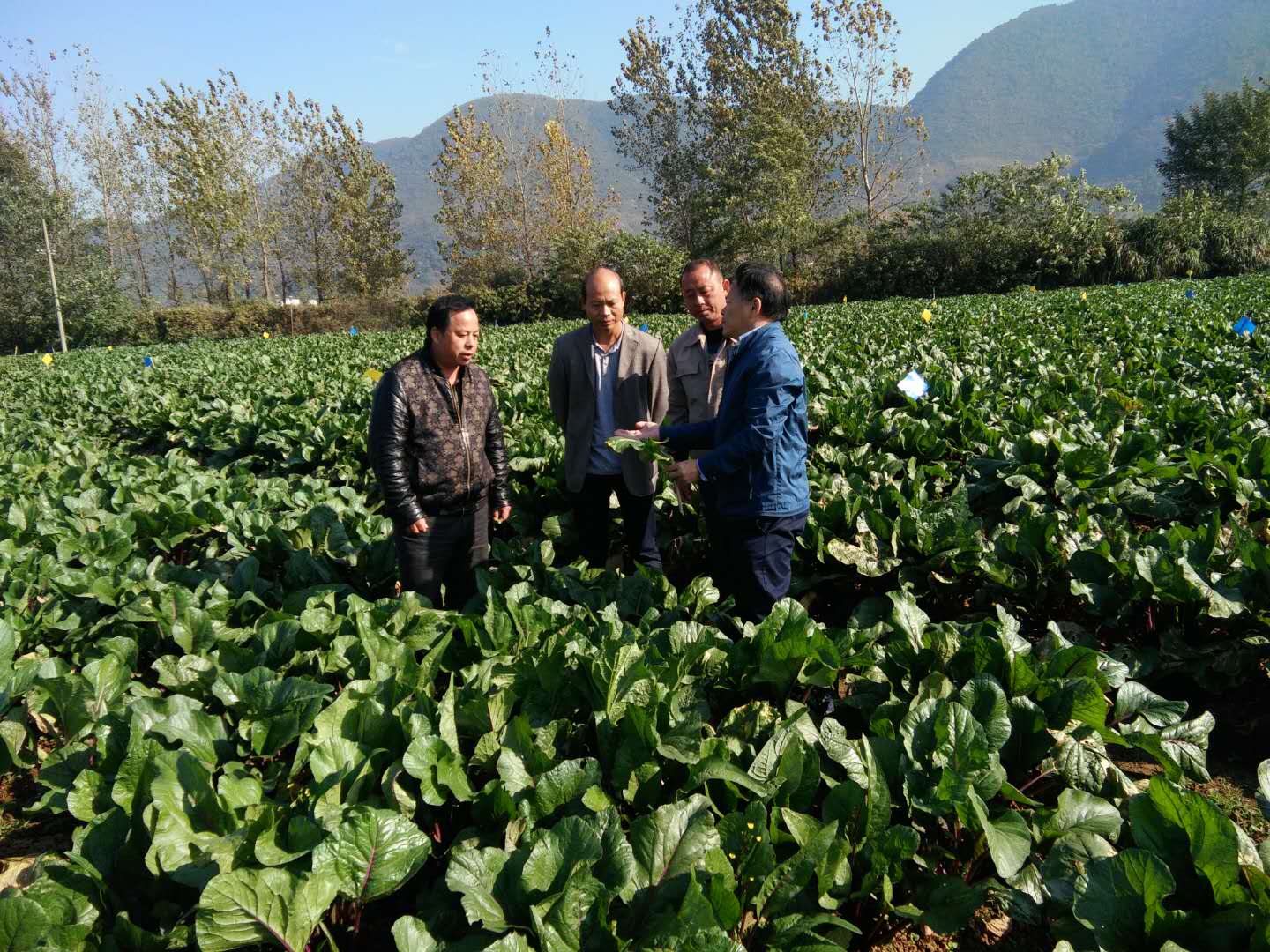 蔬菜公司馬文斌經(jīng)理、曹樹(shù)強(qiáng)經(jīng)理與姚教授討論冬季有機(jī)蔬菜的田間管理工作